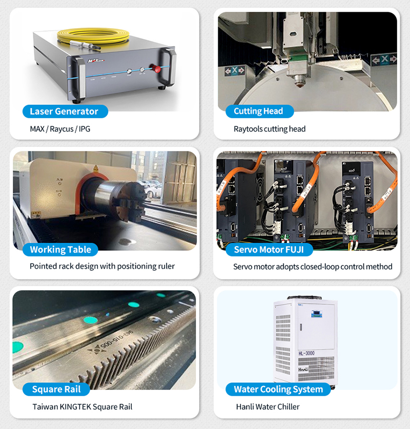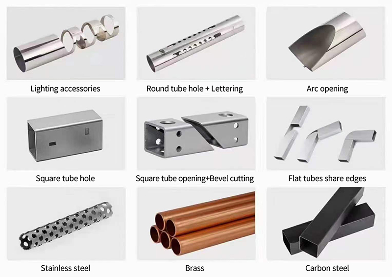 Tube Laser Cutting Machine is mainly used for cutting carbon steel, stainless steel, copper, aluminum and other metal materials. It can process round, square, rectangular, oval and other special-shaped pipes. It adopts precision-grade dual pneumatic chucks, automatically locates the center, and is equipped with a high-precision servo deceleration system. Bevel cutting and automatic loading and unloading devices are optional to save labor costs and improve cutting efficiency.